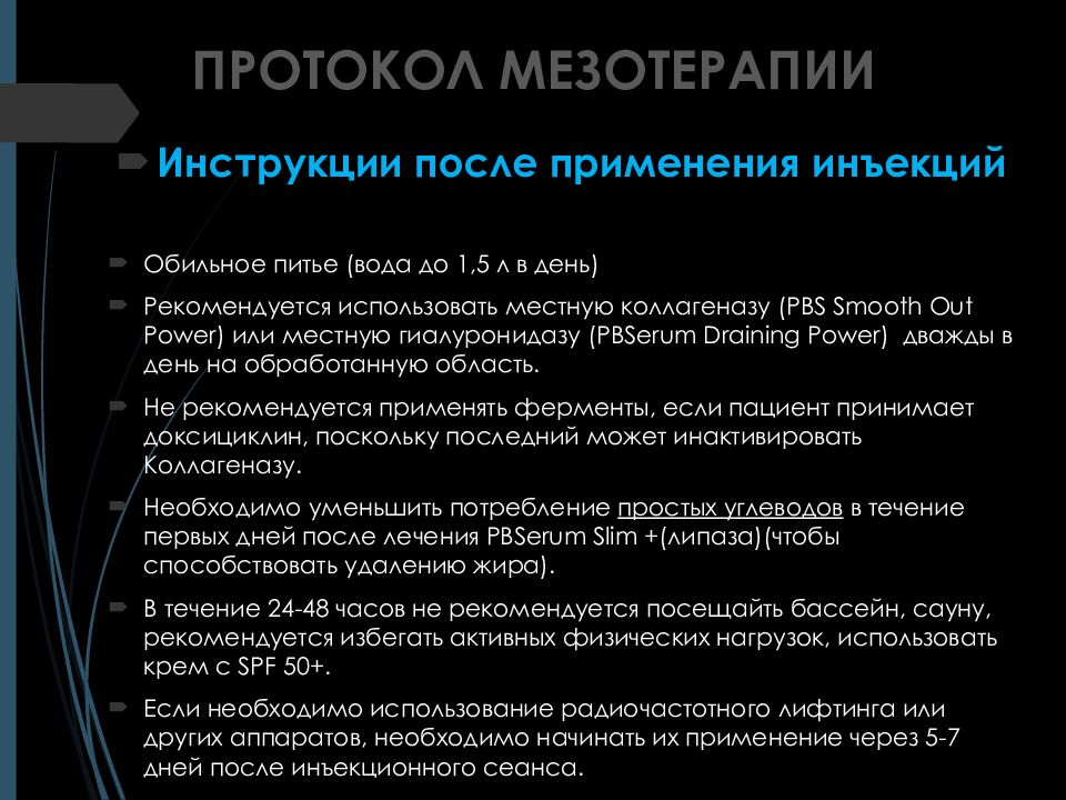Инструкции после применения инъекций Обильное питье (вода до 1,5 л в день) Рекомендуется использовать местную коллагеназу ( PBS Smooth Out Power ) или местную гиалуронидазу ( PBSerum Draining Power ) дважды в день на обработанную область. Не рекомендуется применят ь ферменты, если пациент принимает доксициклин, поскольку последний может инактивировать Коллагеназ у. Необходимо уменьшить потребление простых углеводов в течение первых дней после лечения PBSerum Slim +( липаза) ( чтобы способствовать удалению жира ). В течение 24-48 часов не рекомендуется п осещайт ь бассейн, сауну, рекомендуется избегать активных физических нагрузок, использовать крем с SPF 50+. Если необходимо использование радиочастот ного лифтинга или других аппаратов, необходимо начинат ь их применение через 5-7 дней после инъекционного сеанса.