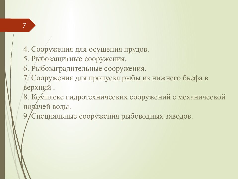 7 4. Сооружения для осушения прудов. 5. Рыбозащитные сооружения. 6. Рыбозаградительные сооружения. 7. Сооружения для пропуска рыбы из нижнего бьефа в верхний. 8. Комплекс гидротехнических сооружений с механической подачей воды. 9. Специальные сооружения рыбоводных заводов.