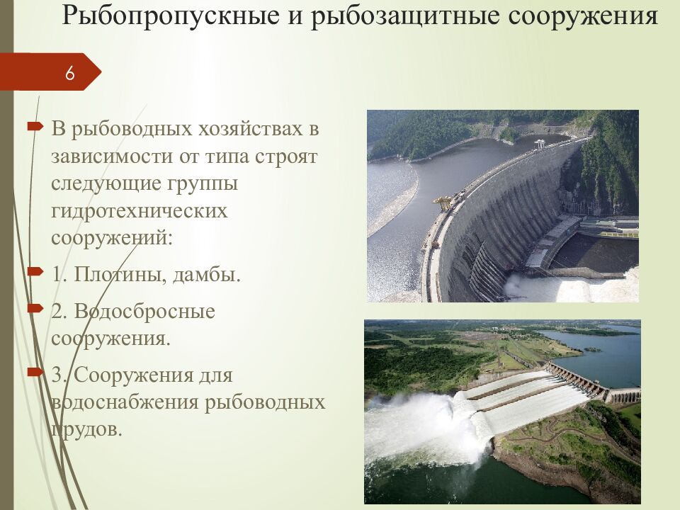 В рыбоводных хозяйствах в зависимости от типа строят следующие группы гидротехнических сооружений: 1. Плотины, дамбы. 2. Водосбросные сооружения. 3. Сооружения для водоснабжения рыбоводных прудов. 6