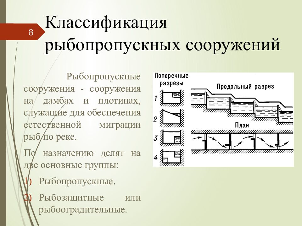 Рыбопропускные сооружения - сооружения на дамбах и плотинах, служащие для обеспечения естественной миграции рыб по реке. По назначению делят на две основные группы: Рыбопропускные. Р ыбозащитные или рыбооградительные. 8 Классификация рыбопропускных сооружений