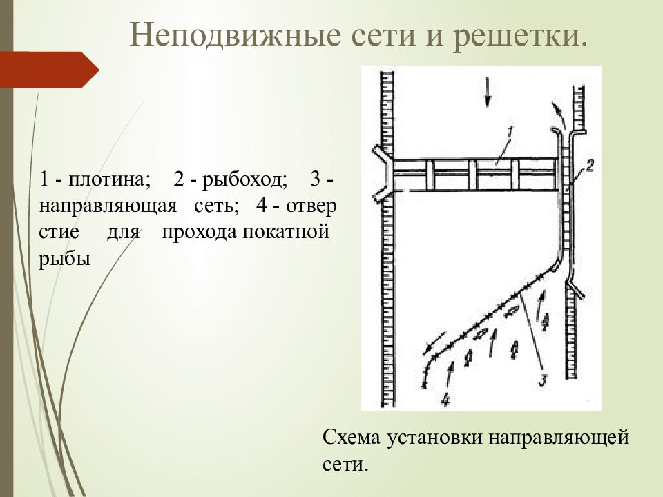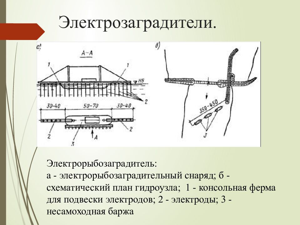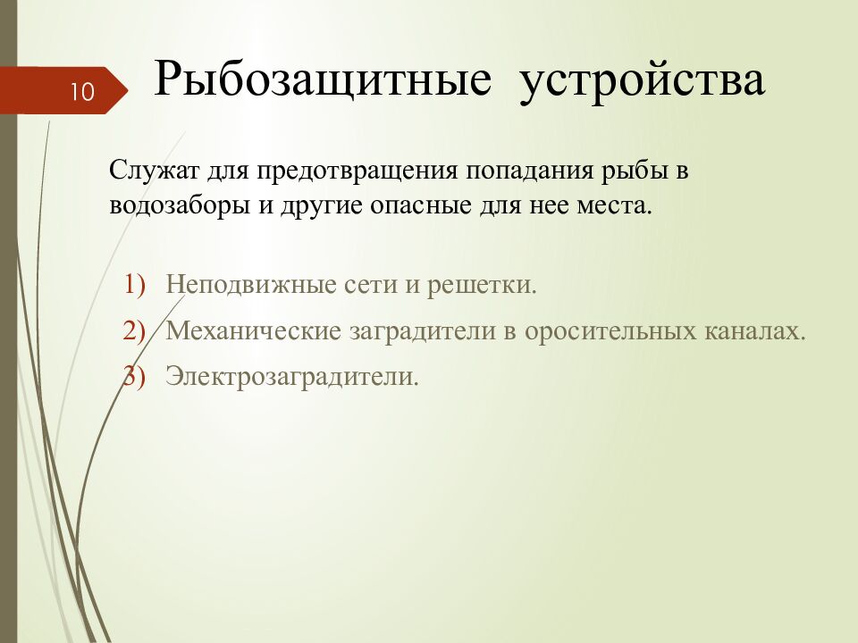 Неподвижные сети и решетки. Механические заградители в оросительных каналах. Электрозаградители. 10 Рыбозащитные устройства Служат для предотвращения попадания рыбы в водозаборы и другие опасные для нее места.