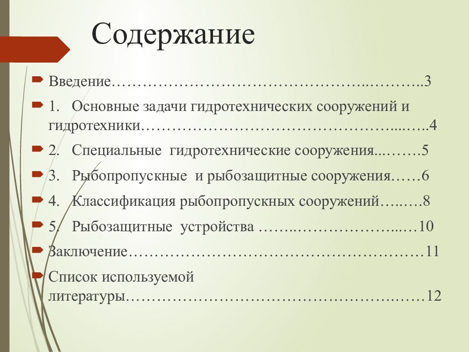 Введение …………………………………………..……….. 3 1. Основные задачи гидротехнических сооружений и гидротехники …………………………………………....….. 4 2. Специальные гидротехнические сооружения...……. 5 3. Рыбопропускные и рыбозащитные сооружения…… 6 4. Классификация рыбопропускных сооружений…..…. 8 5. Рыбозащитные устройства ……..………………...…10 Заключение …………………………………………………11 Список используемой литературы …………………………………………….……12