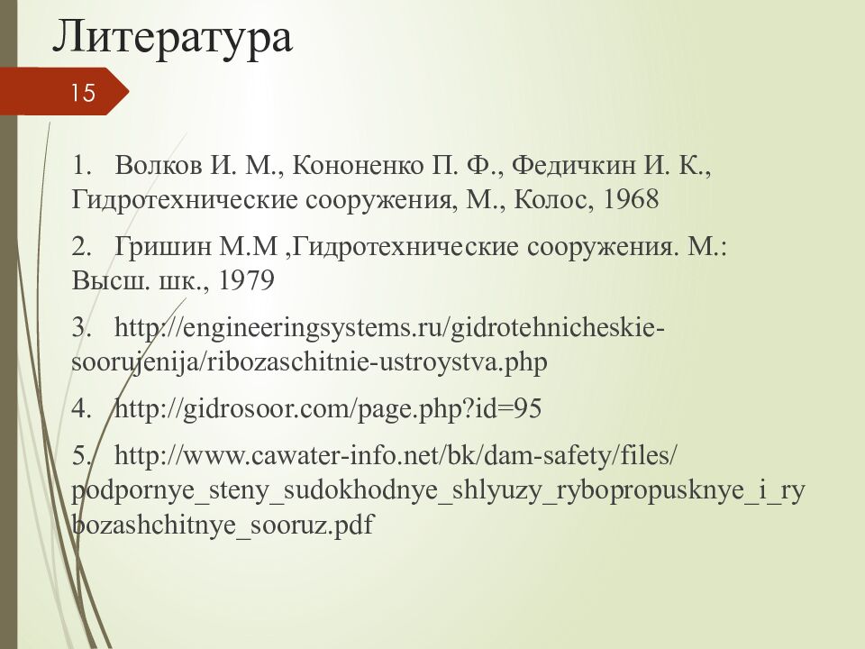 1. Волков И. М., Кононенко П. Ф., Федичкин И. К., Гидротехнические сооружения, М., Колос, 1968 2. Гришин М.М,Гидротехнические сооружения. М.: Высш. шк., 1979 3. http://engineeringsystems.ru/gidrotehnicheskie-soorujenija/ribozaschitnie-ustroystva.php 4. http://gidrosoor.com/page.php?id=95 5. http://www.cawater-info.net/bk/dam-safety/files/podpornye_steny_sudokhodnye_shlyuzy_rybopropusknye_i_rybozashchitnye_sooruz.pdf 15