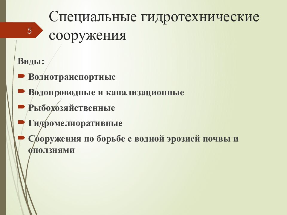 Виды : Воднотранспортные В одопроводные и канализационные Р ыбохозяйственные Г идромелиоративные С ооружения по борьбе с водной эрозией почвы и оползнями 5