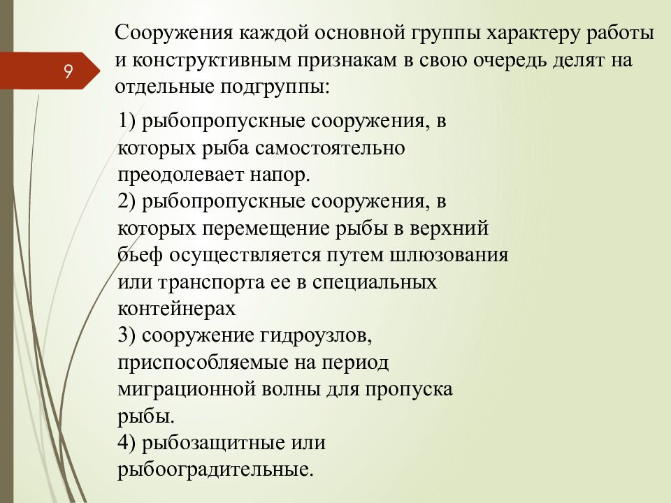 9 Сооружения каждой основной группы характеру работы и конструктивным признакам в свою очередь делят на отдельные подгруппы: 1) рыбопропускные сооружения, в которых рыба самостоятельно преодолевает напор. 2) рыбопропускные сооружения, в которых перемещение рыбы в верхний бьеф осуществляется путем шлюзования или транспорта ее в специальных контейнерах 3 ) сооружение гидроузлов, приспособляемые на период миграционной волны для пропуска рыбы. 4 ) рыбозащитные или рыбооградительные.