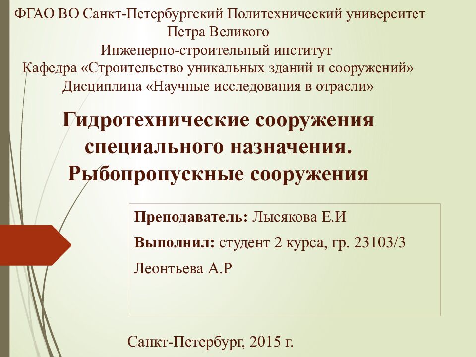 Преподаватель: Лысякова Е.И Выполнил: студент 2 курса, гр. 2310 3/ 3 Леонтьева А.Р Гидротехнические сооружения специального назначения. Рыбопропускные сооружения Санкт-Петербург, 2015 г.
