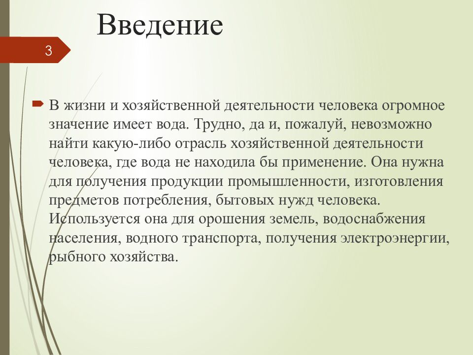 В жизни и хозяйственной деятельности человека огромное значение имеет вода. Трудно, да и, пожалуй, невозможно найти какую-либо отрасль хозяйственной деятельности человека, где вода не находила бы применение. Она нужна для получения продукции промышленности, изготовления предметов потребления, бытовых нужд человека. Используется она для орошения земель, водоснабжения населения, водного транспорта, получения электроэнергии, рыбного хозяйства. 3