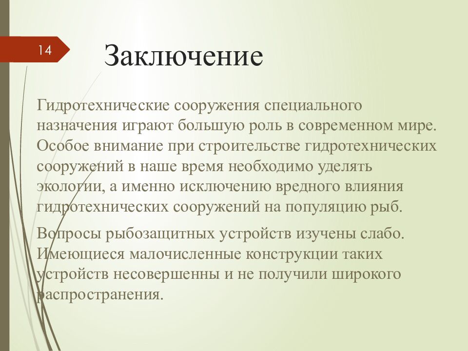 Гидротехнические сооружения специального назначения играют большую роль в современном мире. Особое внимание при строительстве гидротехнических сооружений в наше время необходимо уделять экологии, а именно исключению вредного влияния гидротехнических сооружений на популяцию рыб. Вопросы рыбозащитных устройств изучены слабо. Имеющиеся малочисленные конструкции таких устройств несовершенны и не получили широкого распространения. 14