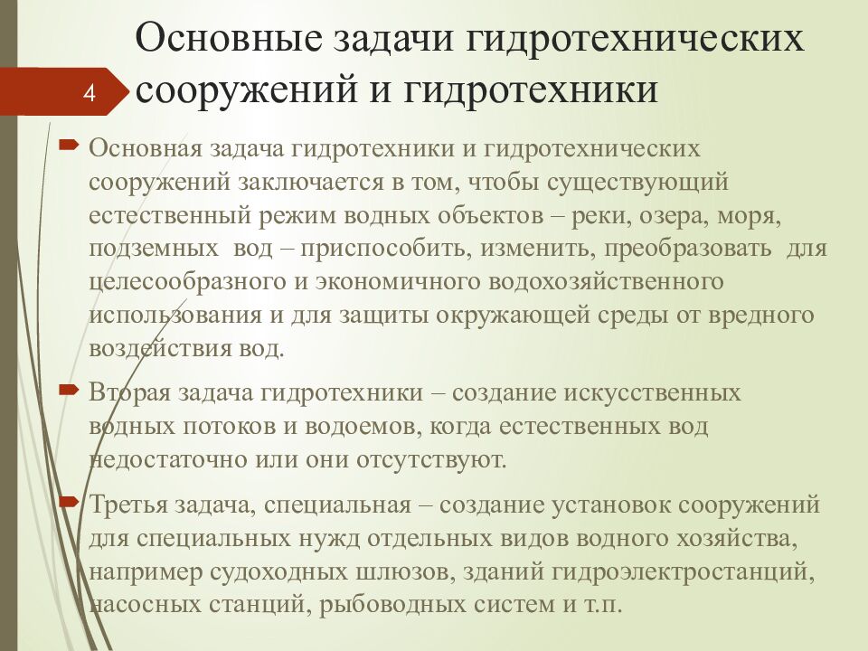 Основная задача гидротехники и гидротехнических сооружений заключается в том, чтобы существующий естественный режим водных объектов – реки, озера, моря, подземных вод – приспособить, изменить, преобразовать для целесообразного и экономичного водохозяйственного использования и для защиты окружающей среды от вредного воздействия вод. Вторая задача гидротехники – создание искусственных водных потоков и водоемов, когда естественных вод недостаточно или они отсутствуют. Третья задача, специальная – создание установок сооружений для специальных нужд отдельных видов водного хозяйства, например судоходных шлюзов, зданий гидроэлектростанций, насосных станций, рыбоводных систем и т.п. 4