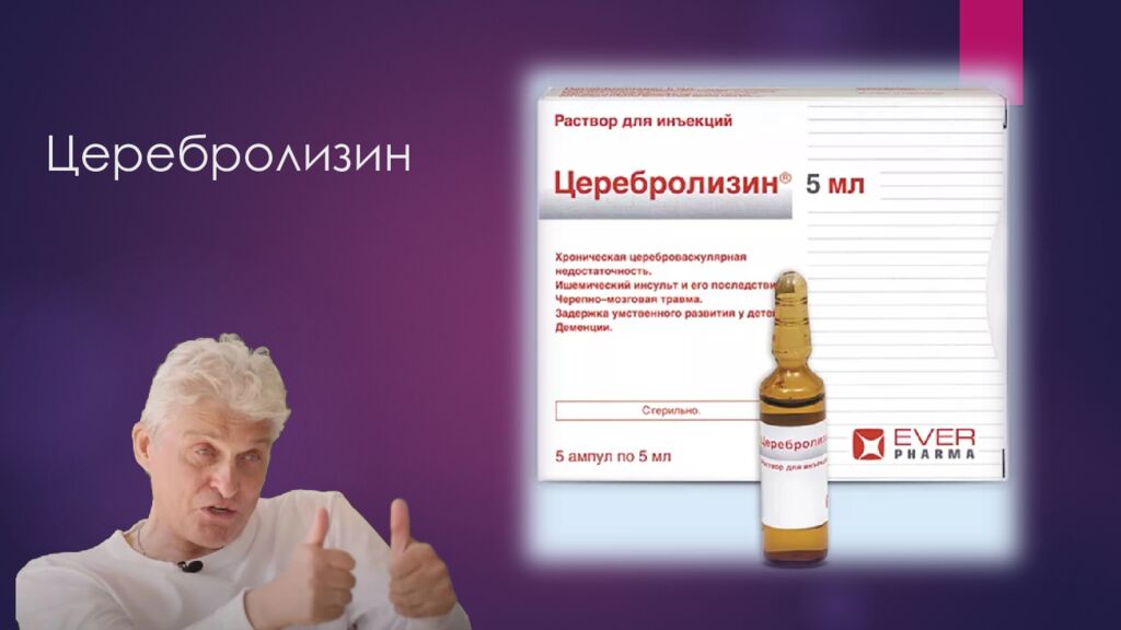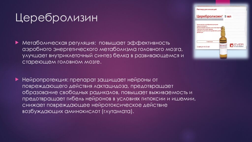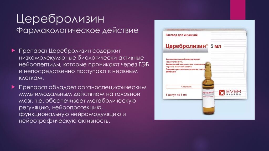 Препарат Церебролизин содержит низкомолекулярные биологически активные нейропептиды, которые проникают через ГЭБ и непосредственно поступают к нервным клеткам. Препарат обладает органоспецифическим мультимодальным действием на головной мозг, т.е. обеспечивает метаболическую регуляцию, нейропротекцию, функциональную нейромодуляцию и нейротрофическую активность.