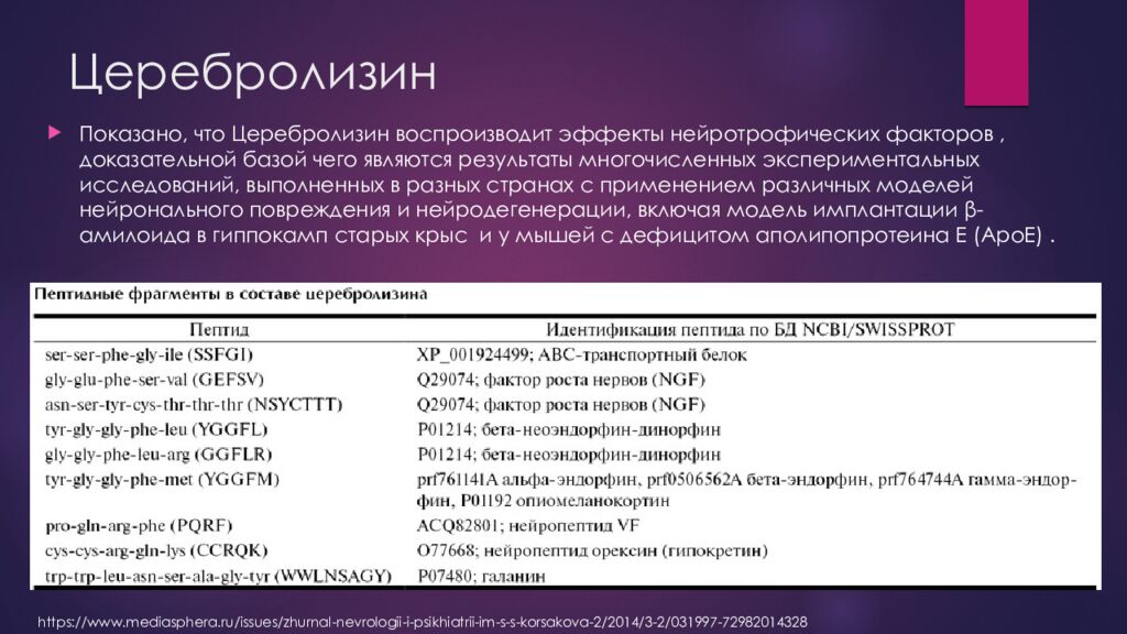 Показано, что Церебролизин воспроизводит эффекты нейротрофических факторов, доказательной базой чего являются результаты многочисленных экспериментальных исследований, выполненных в разных странах с применением различных моделей нейронального повреждения и нейродегенерации, включая модель имплантации β-амилоида в гиппокамп старых крыс и у мышей с дефицитом аполипопротеина E ( ApoE ). https://www.mediasphera.ru/issues/zhurnal-nevrologii-i-psikhiatrii-im-s-s-korsakova-2/2014/3-2/031997-72982014328