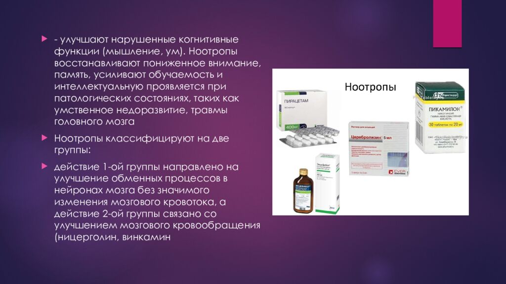 - улучшают нарушенные когнитивные функции (мышление, ум). Ноотропы восстанавливают пониженное внимание, память, усиливают обучаемость и интеллектуальную проявляется при патологических состояниях, таких как умственное недоразвитие, травмы головного мозга Ноотропы классифицируют на две группы: действие 1-ой группы направлено на улучшение обменных процессов в нейронах мозга без значимого изменения мозгового кровотока, а действие 2-ой группы связано со улучшением мозгового кровообращения ( ницерголин, винкамин