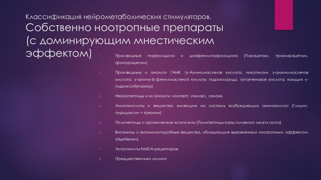 Производные пирролидона и диафенилпирролидона ( Пирацетам, прамирацетам, фонтурацетам ) Производные и аналоги ГАМК ( γ- Аминомасляная кислота, никотиноил γ- аминомасляная кислота, γ- амино - ß- фенилмасляной кислоты гидрохлорид ρ, гопантеновая кислота, кальция γ- гидроксибутират ρ ) Нейропептиды и их аналоги: ноопепт, семакс, селанк. Аминокислоты и вещества, влияющие на систему возбуждающих аминокислот (Глицин, пиридоксин + треонин) Полипептиды и органические композиты (Полипептиды коры головного мозга скота) Витамины и витаминоподобные вещества, обладающие выраженным ноотропным эффектом ( Идебенон ) Антагонисты NMDA-рецепторов Предшественники холина