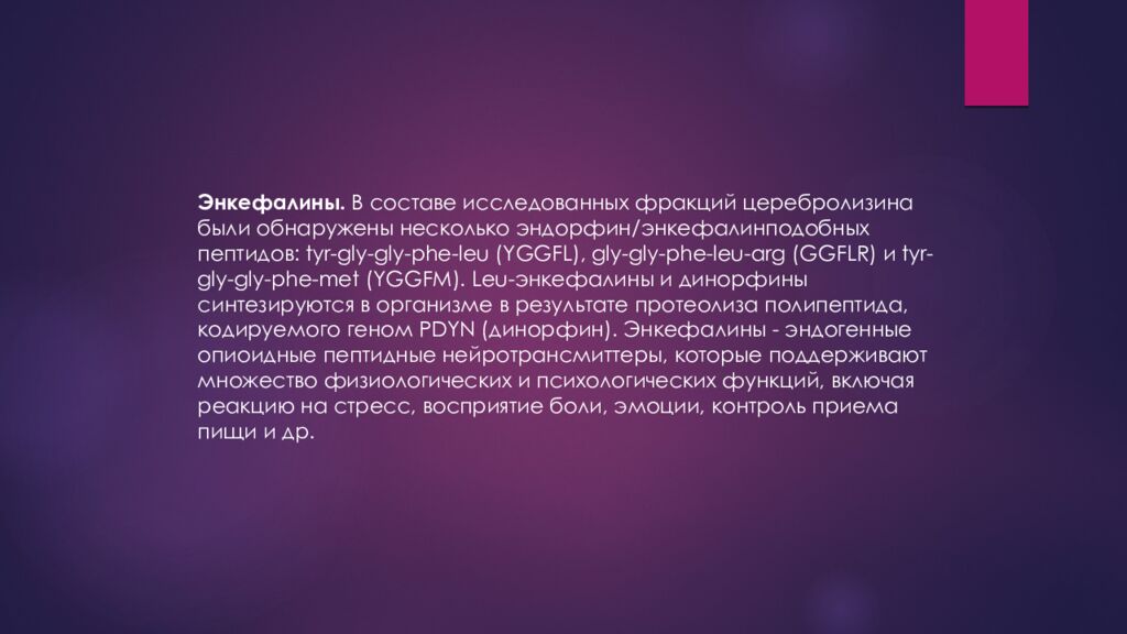 Энкефалины. В составе исследованных фракций церебролизина были обнаружены несколько эндорфин/ энкефалинподобных пептидов: tyr-gly-gly-phe-leu (YGGFL), gly-gly-phe-leu-arg (GGFLR) и tyr-gly-gly-phe-met (YGGFM). Leu -энкефалины и динорфины синтезируются в организме в результате протеолиза полипептида, кодируемого геном PDYN ( динорфин ). Энкефалины - эндогенные опиоидные пептидные нейротрансмиттеры, которые поддерживают множество физиологических и психологических функций, включая реакцию на стресс, восприятие боли, эмоции, контроль приема пищи и др.