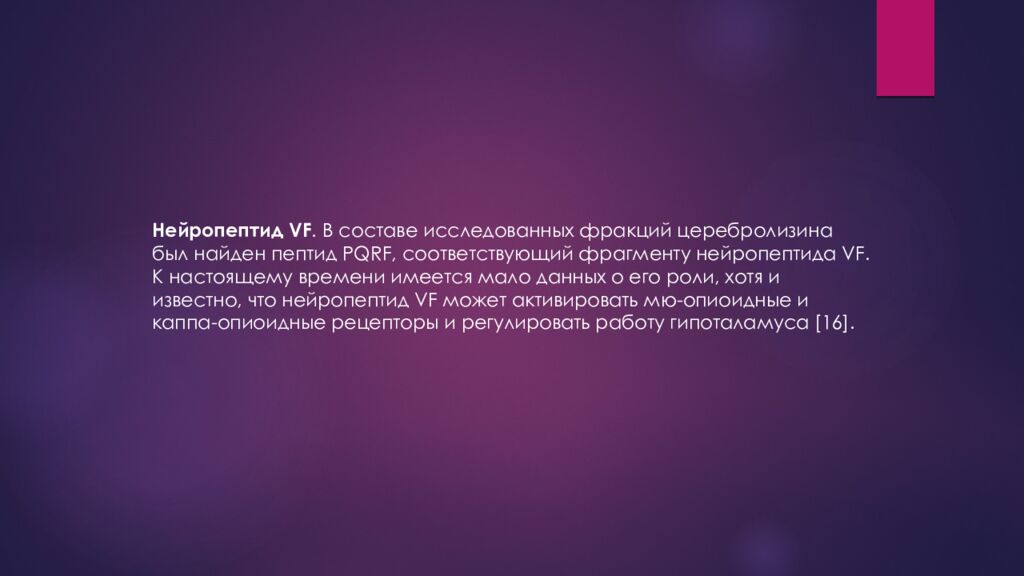 Нейропептид VF. В составе исследованных фракций церебролизина был найден пептид PQRF, соответствующий фрагменту нейропептида VF. К настоящему времени имеется мало данных о его роли, хотя и известно, что нейропептид VF может активировать мю-опиоидные и каппа-опиоидные рецепторы и регулировать работу гипоталамуса [16].