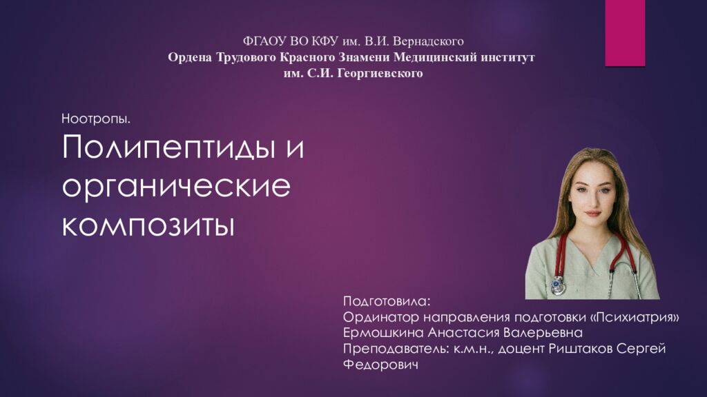 ФГАОУ ВО КФУ им. В.И. Вернадского Ордена Трудового Красного Знамени Медицинский институт им. С.И. Георгиевского Ноотропы. Полипептиды и органические композиты Подготовила: Ординатор направления подготовки «Психиатрия» Ермошкина Анастасия Валерьевна Преподаватель: к.м.н., доцент Риштаков Сергей Федорович