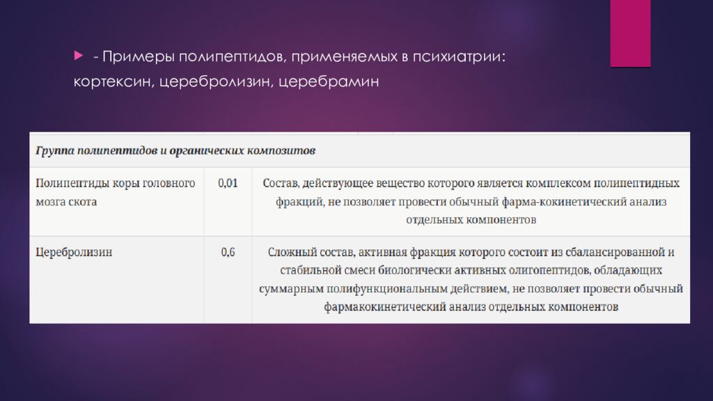 - Примеры полипептидов, применяемых в психиатрии: кортексин, церебролизин, церебрамин