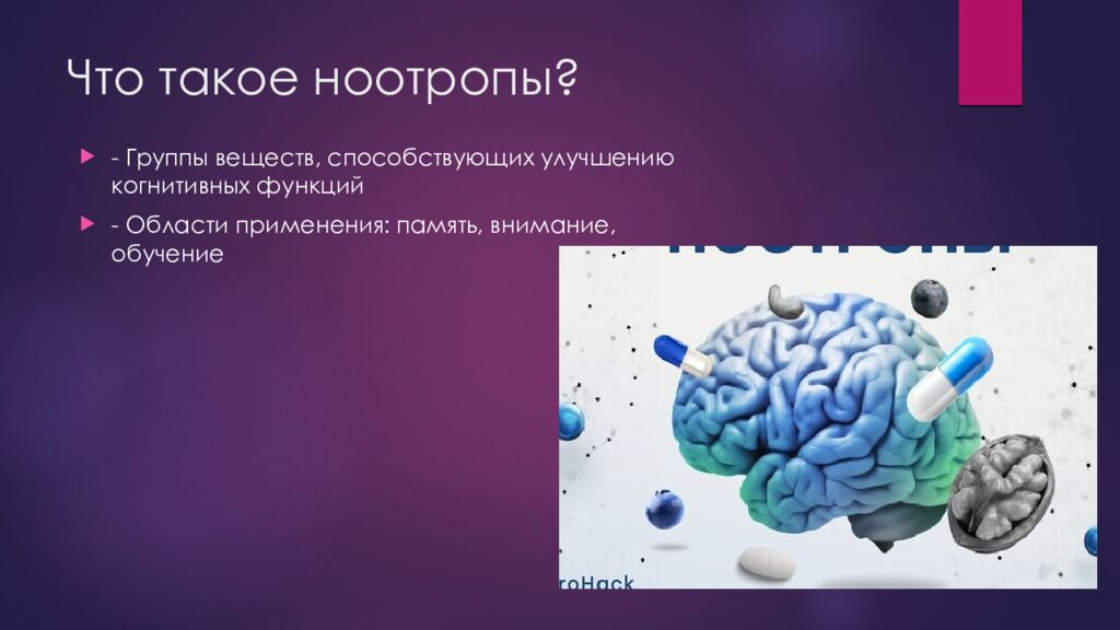 - Группы веществ, способствующих улучшению когнитивных функций - Области применения: память, внимание, обучение