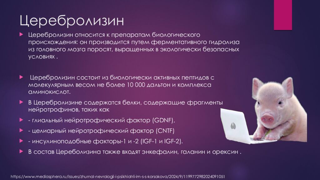 Церебролизин относится к препаратам биологического происхождения: он производится путем ферментативного гидролиза из головного мозга поросят, выращенных в экологически безопасных условиях. Церебролизин состоит из биологически активных пептидов с молекулярным весом не более 10 000 дальтон и комплекса аминокислот. В Церебролизине содержатся белки, содержащие фрагменты нейротрофинов, таких как - глиальный нейротрофический фактор (GDNF), - целиарный нейротрофический фактор (CNTF) - инсулиноподобные факторы-1 и -2 (IGF-1 и IGF-2). В состав Цереболизина также входят энкефалин, галанин и орексин. https://www.mediasphera.ru/issues/zhurnal-nevrologii-i-psikhiatrii-im-s-s-korsakova/2024/9/1199772982024091051
