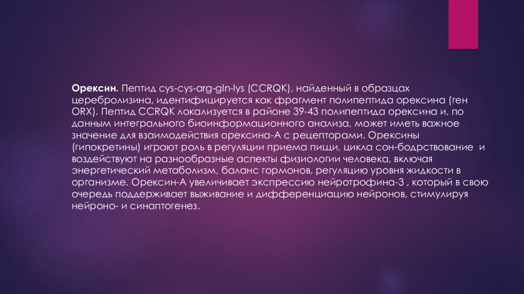 Орексин. Пептид cys-cys-arg-gln-lys (CCRQK), найденный в образцах церебролизина, идентифицируется как фрагмент полипептида орексина (ген ORX). Пептид CCRQK локализуется в районе 39-43 полипептида орексина и, по данным интегрального биоинформационного анализа, может иметь важное значение для взаимодействия орексина -А с рецепторами. Орексины ( гипокретины ) играют роль в регуляции приема пищи, цикла сон-бодрствование и воздействуют на разнообразные аспекты физиологии человека, включая энергетический метаболизм, баланс гормонов, регуляцию уровня жидкости в организме. Орексин -А увеличивает экспрессию нейротрофина-3, который в свою очередь поддерживает выживание и дифференциацию нейронов, стимулируя нейроно - и синаптогенез.