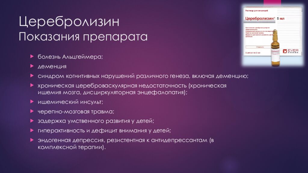 Нейротрофическая активность: Церебролизин - единственный ноотропный пептидергический препарат с доказанной нейротрофической активностью, аналогичной действию естественных факторов нейронального роста (NGF), но проявляющейся в условиях периферического введения. Функциональная нейромодуляция : препарат оказывает положительное влияние при нарушениях когнитивных функций на процессы запоминания.