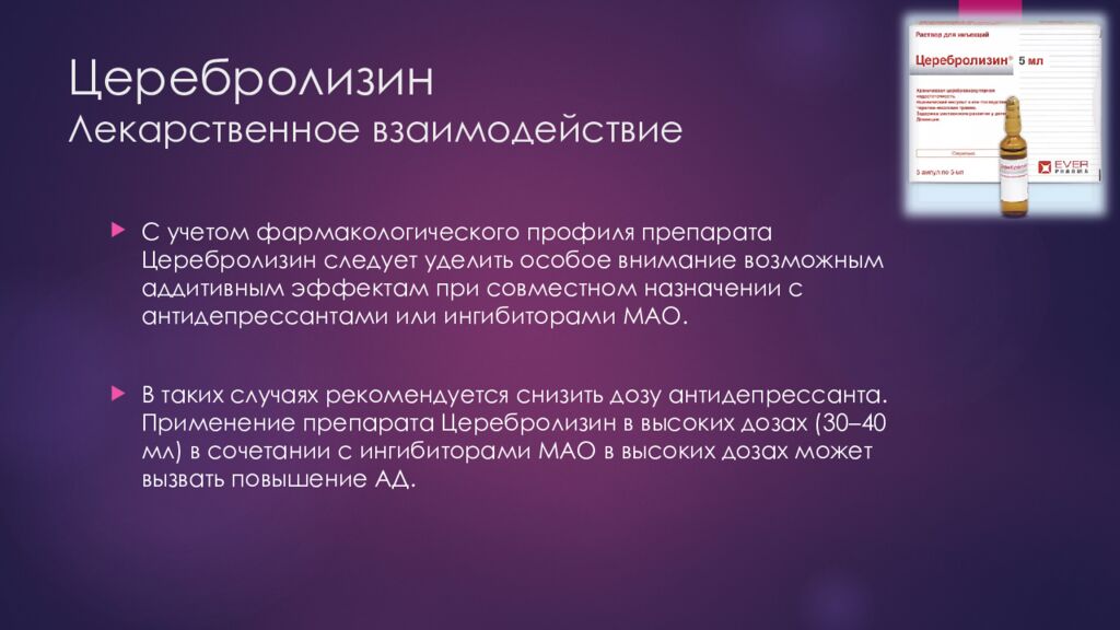 С учетом фармакологического профиля препарата Церебролизин следует уделить особое внимание возможным аддитивным эффектам при совместном назначении с антидепрессантами или ингибиторами МАО. В таких случаях рекомендуется снизить дозу антидепрессанта. Применение препарата Церебролизин в высоких дозах (30–40 мл) в сочетании с ингибиторами МАО в высоких дозах может вызвать повышение АД.