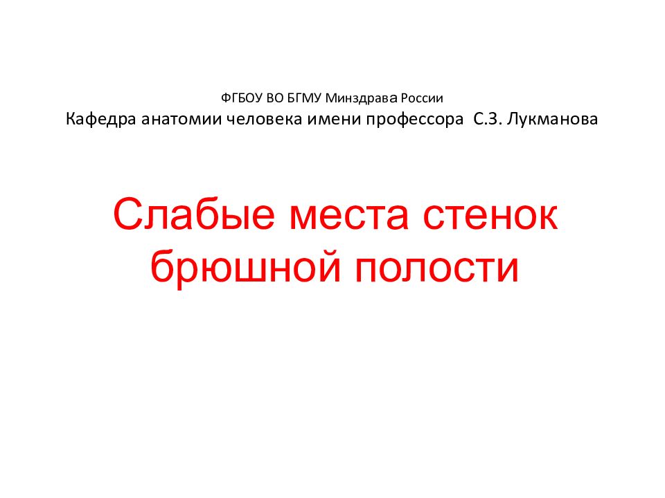 Первый слайд презентации: ФГБОУ ВО БГМУ Минздрав а России Кафедра анатомии человека имени профессора С.З. Лукманова