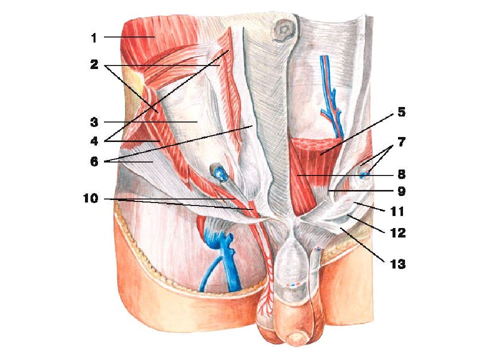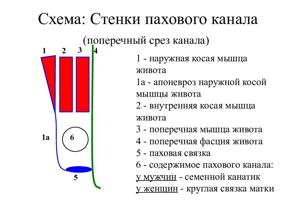 1 - наружная косая мышца живота 1а - апоневроз наружной косой мышцы живота 2 - внутренняя косая мышца живота 3 - поперечная мышца живота 4 - поперечная фасция живота 5 - паховая связка 6 - содержимое пахового канала: у мужчин - семенной канатик у женщин - круглая связка матки 1 2 3 4 1а 5 6