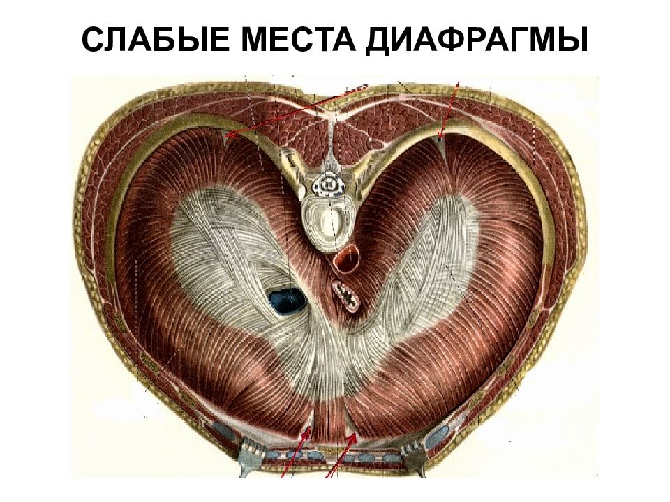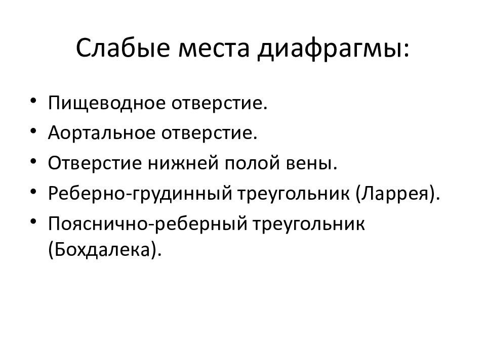 Пищеводное отверстие. Аортальное отверстие. Отверстие нижней полой вены. Реберно-грудинный треугольник (Ларрея). Пояснично-реберный треугольник (Бохдалека).