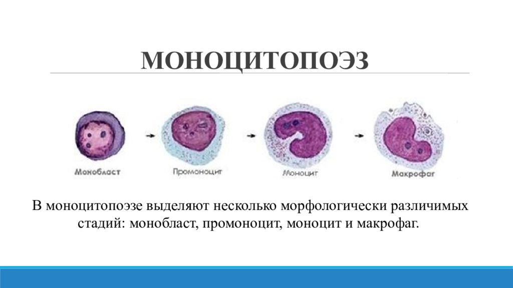 В моноцитопоэзе выделяют несколько морфологически различимых стадий: монобласт, промоноцит, моноцит и макрофаг.
