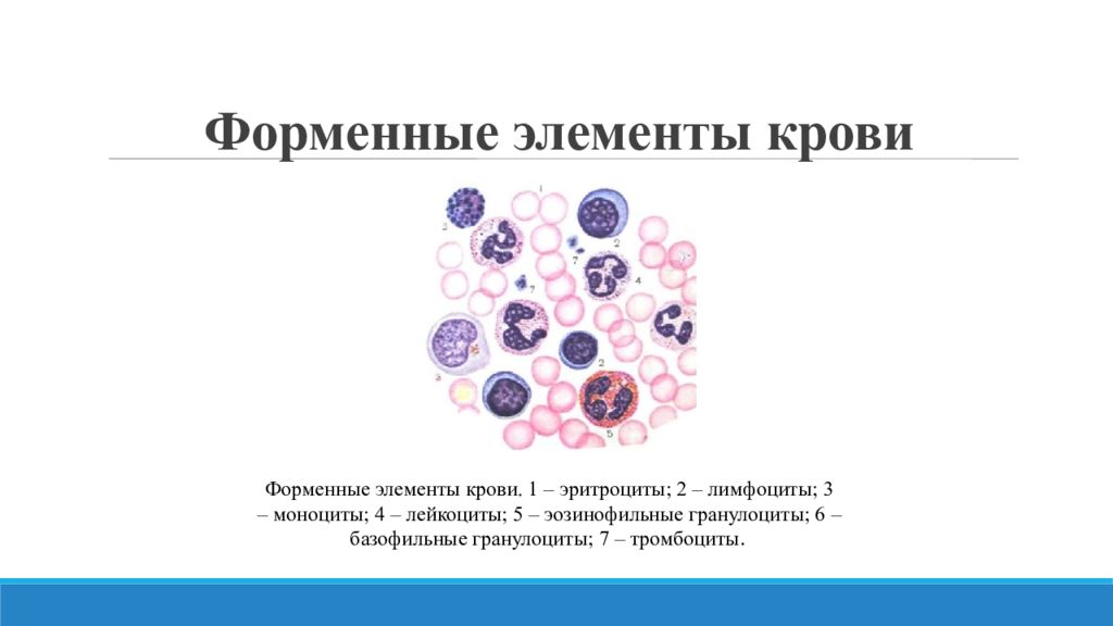 Форменные элементы крови. 1 – эритроциты; 2 – лимфоциты; 3 – моноциты; 4 – лейкоциты; 5 – эозинофильные гранулоциты; 6 – базофильные гранулоциты; 7 – тромбоциты.