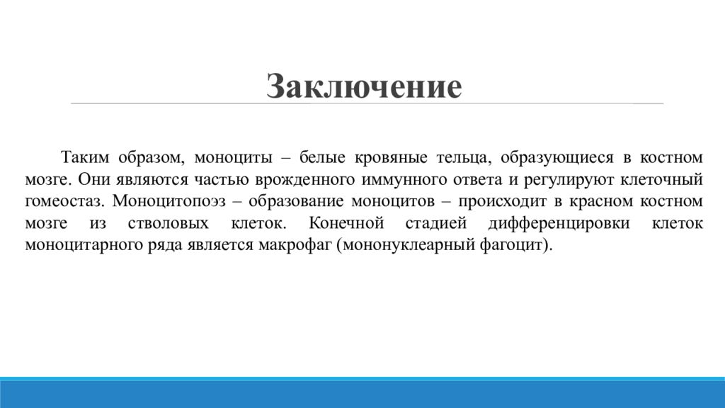Таким образом, моноциты – белые кровяные тельца, образующиеся в костном мозге. Они являются частью врожденного иммунного ответа и регулируют клеточный гомеостаз. Моноцитопоэз – образование моноцитов – происходит в красном костном мозге из стволовых клеток. Конечной стадией дифференцировки клеток моноцитарного ряда является макрофаг ( мононуклеарный фагоцит).