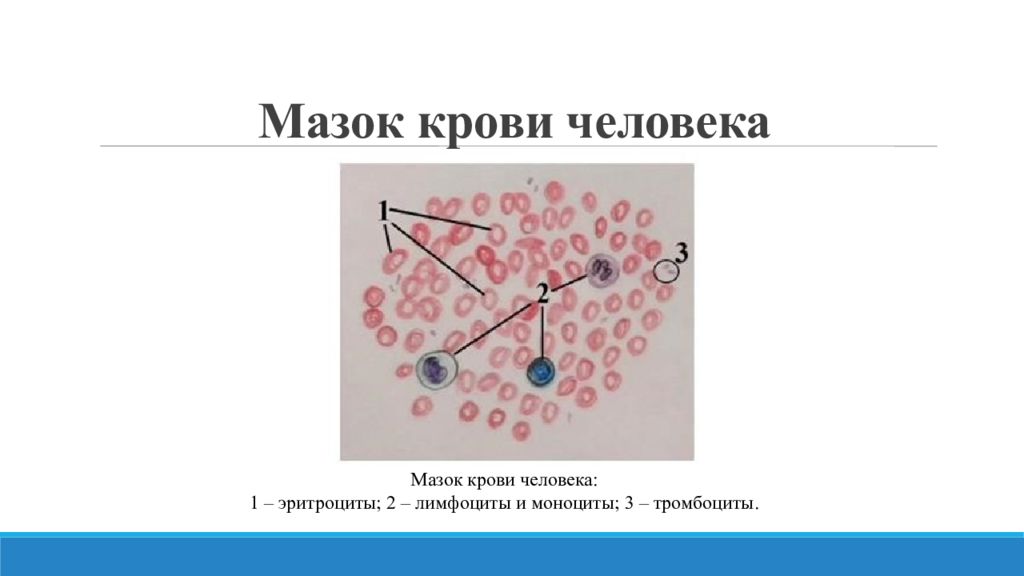 Мазок крови человека: 1 – эритроциты; 2 – лимфоциты и моноциты; 3 – тромбоциты.