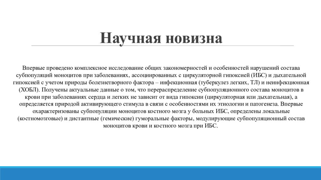 Впервые проведено комплексное исследование общих закономерностей и особенностей нарушений состава субпопуляций моноцитов при заболеваниях, ассоциированных с циркуляторной гипоксией (ИБС) и дыхательной гипоксией с учетом природы болезнетворного фактора – инфекционная (туберкулез легких, ТЛ) и неинфекционная (ХОБЛ). Получены актуальные данные о том, что перераспределение субпопуляционного состава моноцитов в крови при заболеваниях сердца и легких не зависит от вида гипоксии (циркуляторная или дыхательная), а определяется природой активирующего стимула в связи с особенностями их этиологии и патогенеза. Впервые охарактеризованы субпопуляции моноцитов костного мозга у больных ИБС, определены локальные (костномозговые) и дистантные ( гемические ) гуморальные факторы, модулирующие субпопуляционный состав моноцитов крови и костного мозга при ИБС.