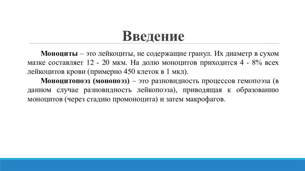Моноциты – это лейкоциты, не содержащие гранул. Их диаметр в сухом мазке составляет 12 - 20 мкм. На долю моноцитов приходится 4 - 8% всех лейкоцитов крови (примерно 450 клеток в 1 мкл ). Моноцитопоэз ( монопоэз ) – это разновидность процессов гемопоэза (в данном случае разновидность лейкопоэза ), приводящая к образованию моноцитов (через стадию промоноцита ) и затем макрофагов.