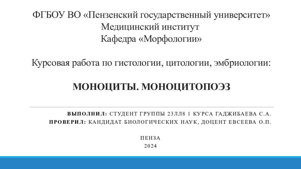 Первый слайд презентации: ФГБОУ ВО «Пензенский государственный университет» Медицинский институт Кафедра «Морфологии» Курсовая работа по гистологии, цитологии, эмбриологии : МОНОЦИТЫ. МОНОЦИТОПОЭЗ
