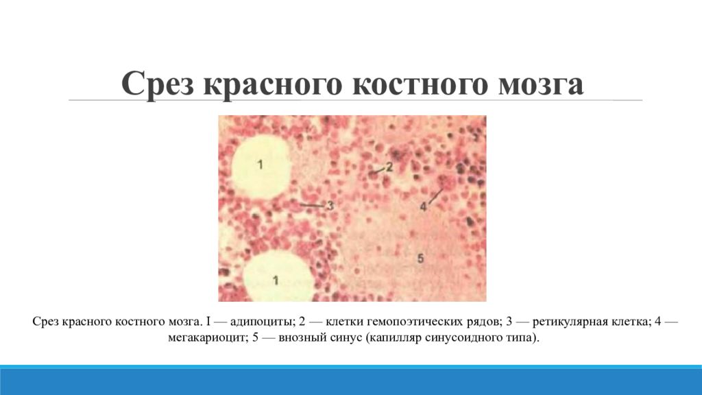 Срез красного костного мозга. I — адипоциты ; 2 — клетки гемопоэтических рядов; 3 — ретикулярная клетка; 4 — мегакариоцит; 5 — внозный синус (капилляр синусоидного типа).