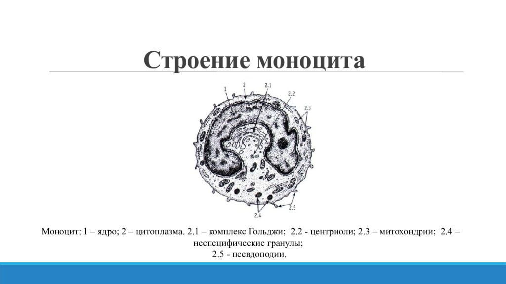 Моноцит: 1 – ядро; 2 – цитоплазма. 2.1 – комплекс Гольджи ; 2.2 - центриоли; 2.3 – митохондрии; 2.4 – неспецифические гранулы; 2.5 - псевдоподии.