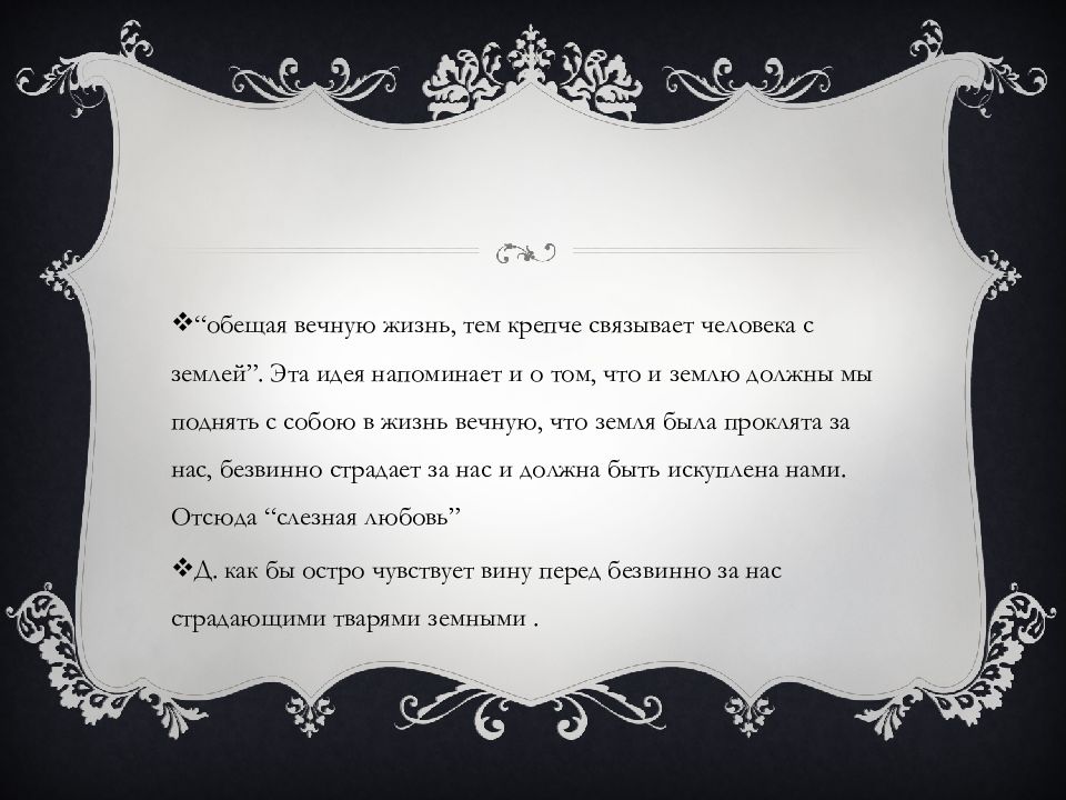 “обещая вечную жизнь, тем крепче связывает человека с землей”. Эта идея напоминает и о том, что и землю должны мы поднять с собою в жизнь вечную, что земля была проклята за нас, безвинно страдает за нас и должна быть искуплена нами. Отсюда “слезная любовь ” Д. как бы остро чувствует вину перед безвинно за нас страдающими тварями земными.