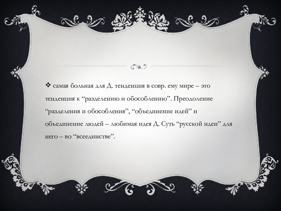 самая больная для Д. тенденция в совр. ему мире – это тенденция к “разделению и обособлению”. Преодоление “разделения и обособления”, “объединение идей” и объединение людей – любимая идея Д. Суть “русской идеи” для него – во “ всеединстве”.