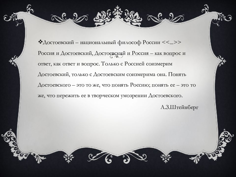 Достоевский – национальный философ России <<...>> Россия и Достоевский, Достоевский и Россия – как вопрос и ответ, как ответ и вопрос. Только с Россией соизмерим Достоевский, только с Достоевским соизмерима она. Понять Достоевского – это то же, что понять Россию; понять ее – это то же, что пережить ее в творческом умозрении Достоевского. А.З.Штейнберг