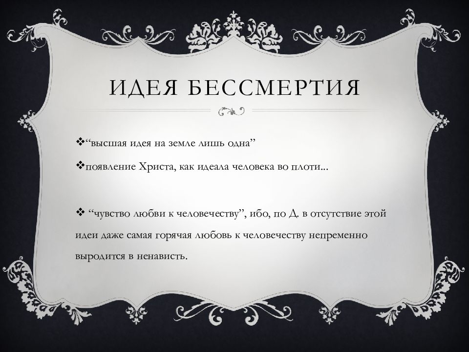“высшая идея на земле лишь одна ” появление Христа, как идеала человека во плоти... “чувство любви к человечеству”, ибо, по Д. в отсутствие этой идеи даже самая горячая любовь к человечеству непременно выродится в ненависть.