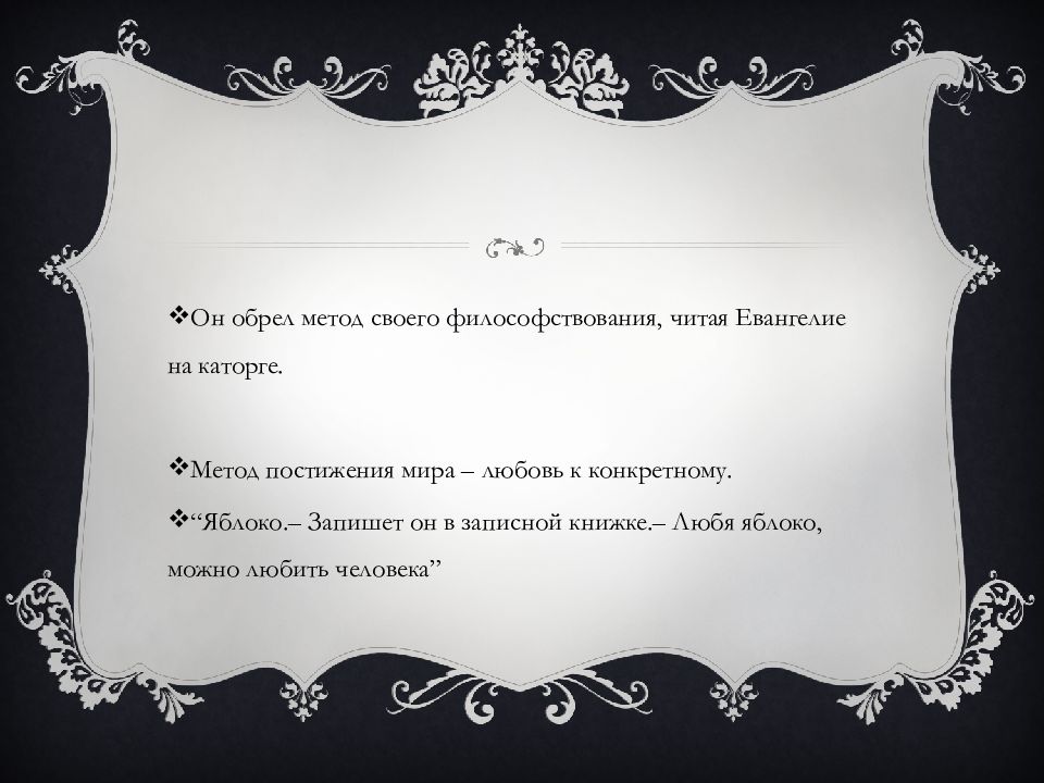 Он обрел метод своего философствования, читая Евангелие на каторге. Метод постижения мира – любовь к конкретному. “Яблоко.– Запишет он в записной книжке.– Любя яблоко, можно любить человека”