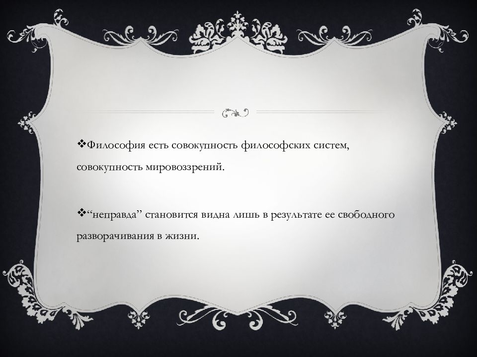 Философия есть совокупность философских систем, совокупность мировоззрений. “неправда” становится видна лишь в результате ее свободного разворачивания в жизни.