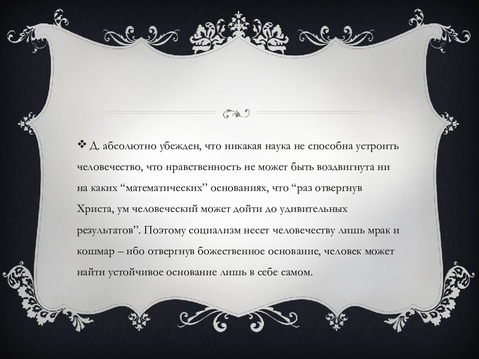Д. абсолютно убежден, что никакая наука не способна устроить человечество, что нравственность не может быть воздвигнута ни на каких “математических” основаниях, что “раз отвергнув Христа, ум человеческий может дойти до удивительных результатов ”. Поэтому социализм несет человечеству лишь мрак и кошмар – ибо отвергнув божественное основание, человек может найти устойчивое основание лишь в себе самом.