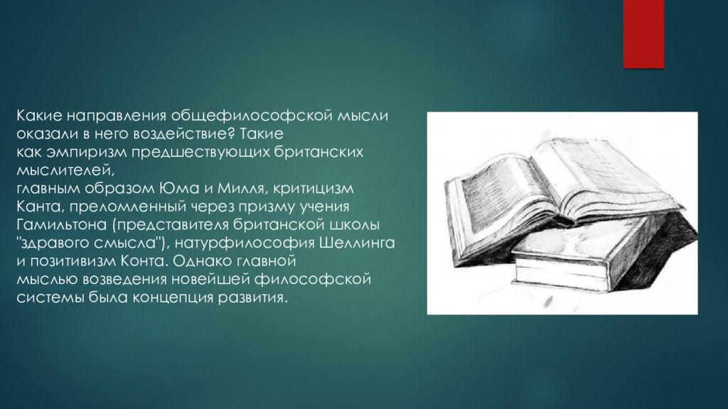 Какие направления общефилософской мысли оказали в него воздействие? Такие как эмпиризм предшествующих британских мыслителей, главным образом Юма и Милля, критицизм Канта, преломленный через призму учения Гамильтона (представителя британской школы "здравого смысла"), натурфилософия Шеллинга и позитивизм Конта. Однако главной мыслью возведения новейшей философской системы была концепция развития.