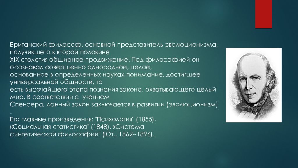 Британский философ, основной представитель эволюционизма, получившего в второй половине XIX столетия обширное продвижение. Под философией он осознавал совершенно однородное, целое, основанное в определенных науках понимание, достигшее универсальной общности, то есть высочайшего этапа познания закона, охватывающего целый мир. В соответствии с учением Спенсера, данный закон заключается в развитии (эволюционизм). Его главные произведения: "Психология" (1855 ), «Социальная статистика" (1848), «Система синтетической философии" (Ют., 1862--1896).