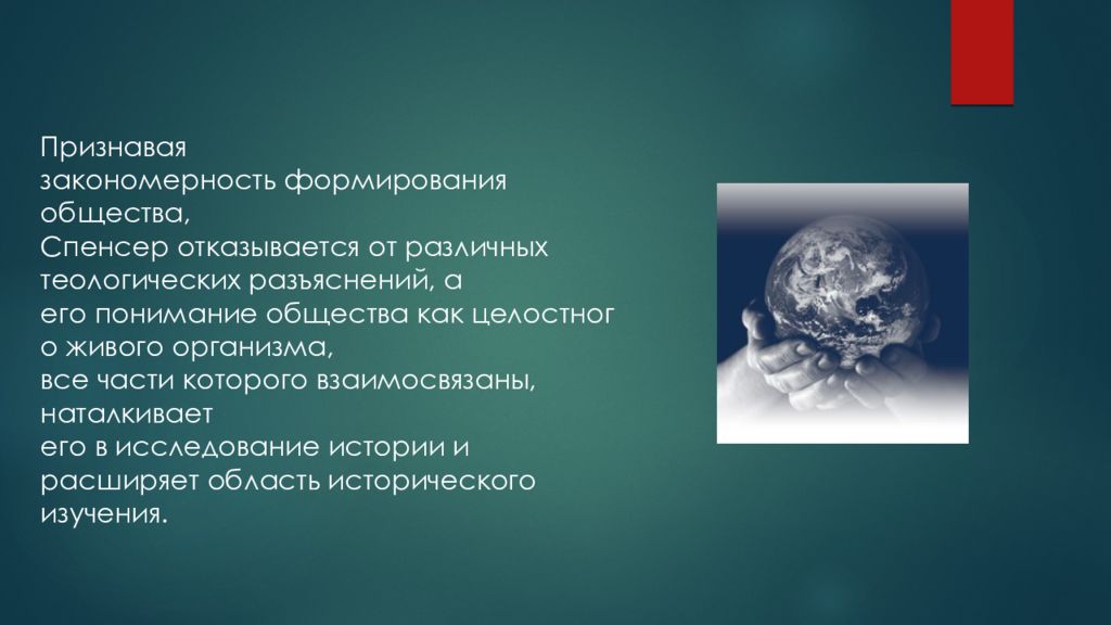 Признавая закономерность формирования общества, Спенсер отказывается от различных теологических разъяснений, а его понимание общества как целостного живого организма, все части которого взаимосвязаны, наталкивает его в исследование истории и расширяет область исторического изучения.