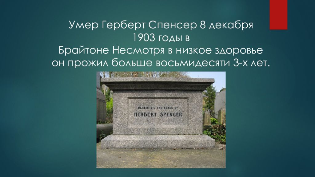 Умер Герберт Спенсер 8 декабря 1903 годы в Брайтоне Несмотря в низкое здоровье он прожил больше восьмидесяти 3-х лет.