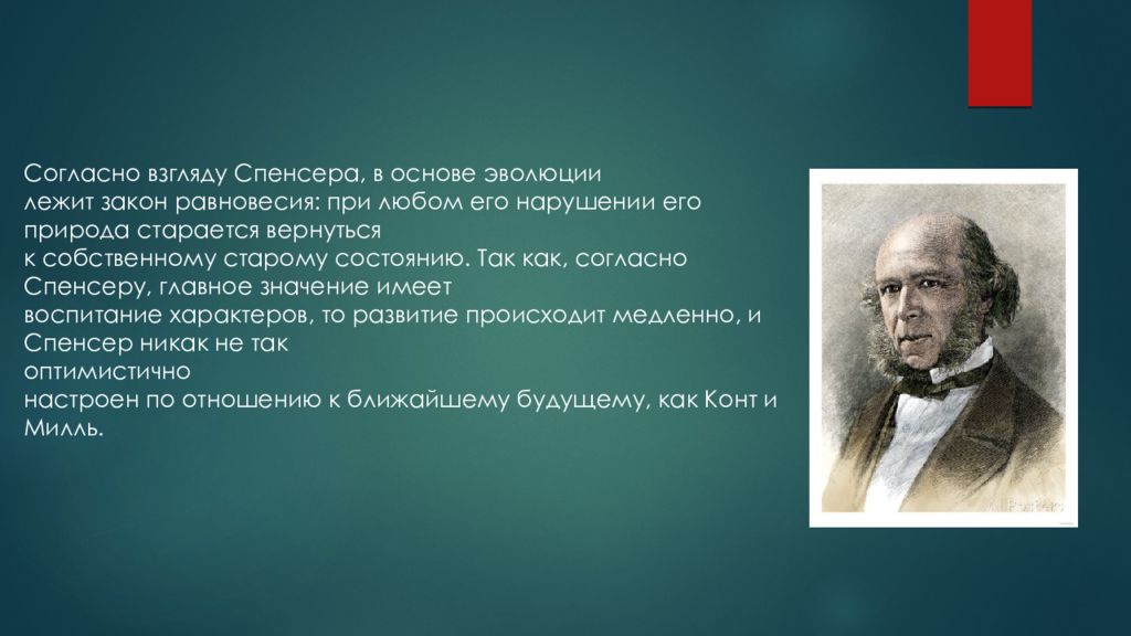 Согласно взгляду Спенсера, в основе эволюции лежит закон равновесия: при любом его нарушении его природа старается вернуться к собственному старому состоянию. Так как, согласно Спенсеру, главное значение имеет воспитание характеров, то развитие происходит медленно, и Спенсер никак не так оптимистично настроен по отношению к ближайшему будущему, как Конт и Милль.